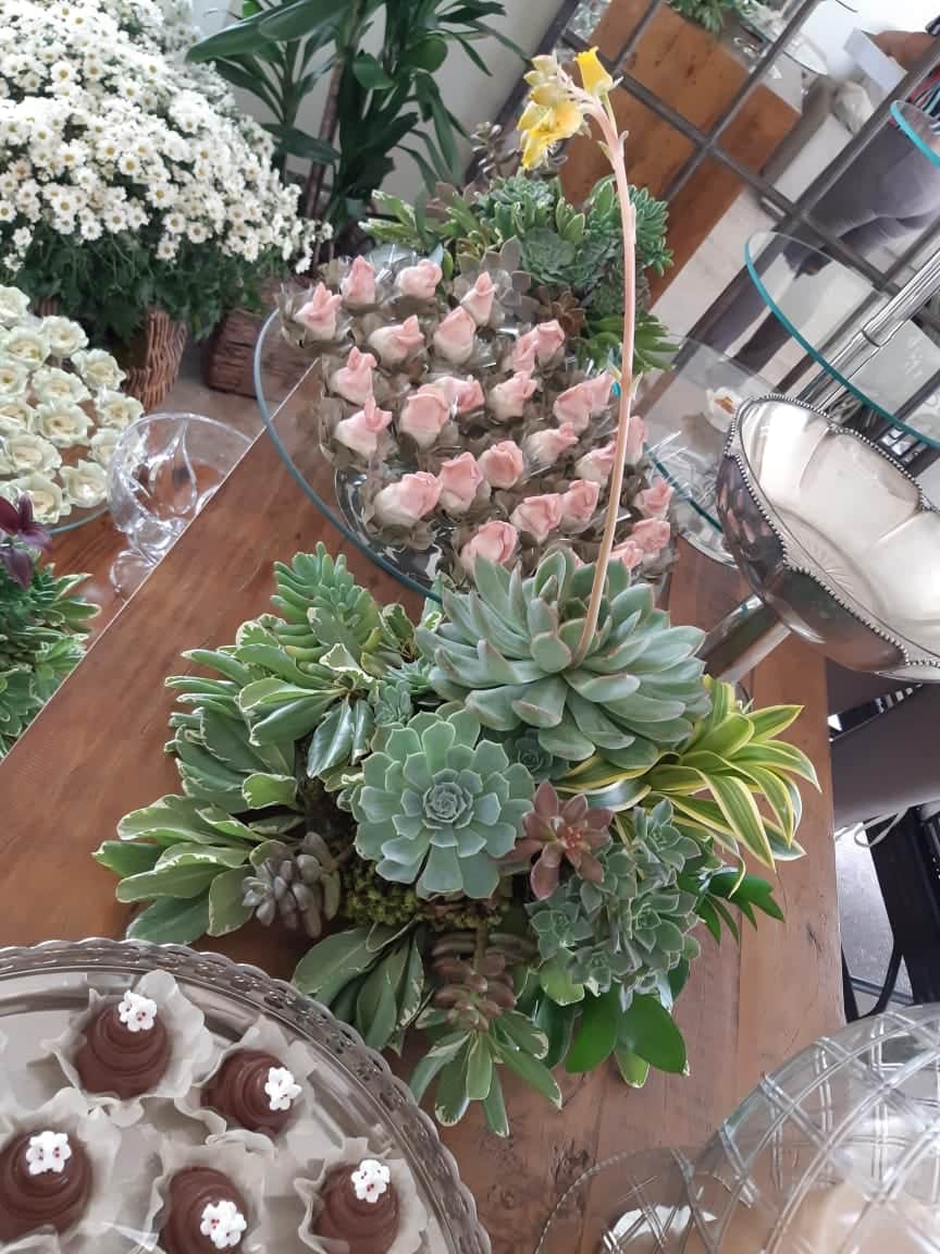 Flores mais delicadas e de cores suaves ficam muito bonitas, e também arranjos com folhagens e suculentas.